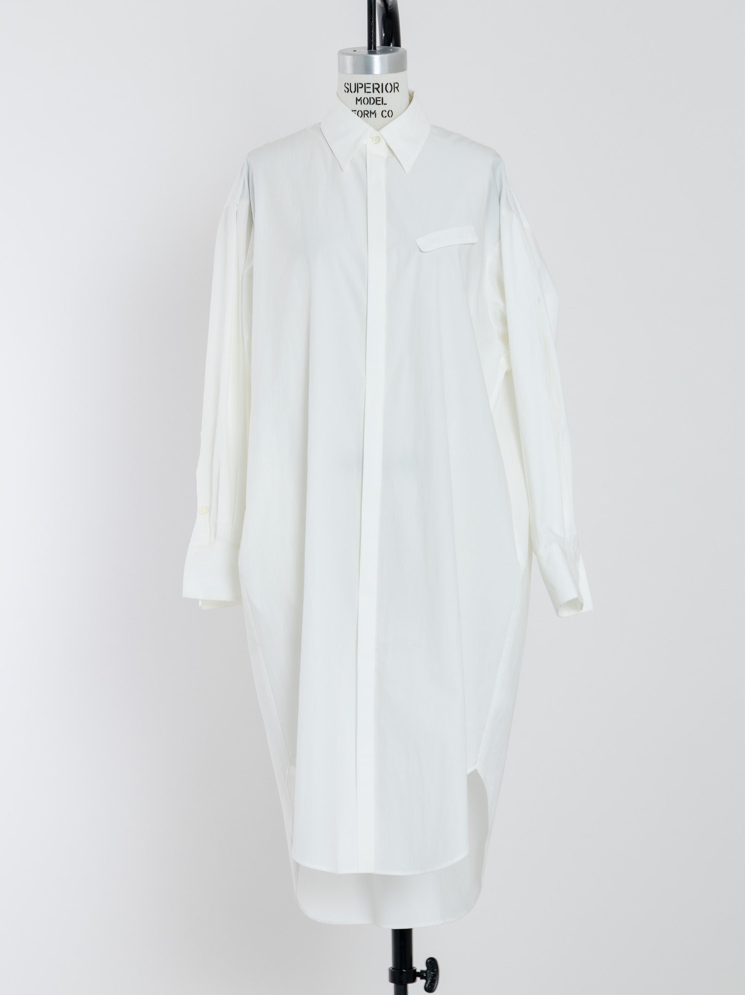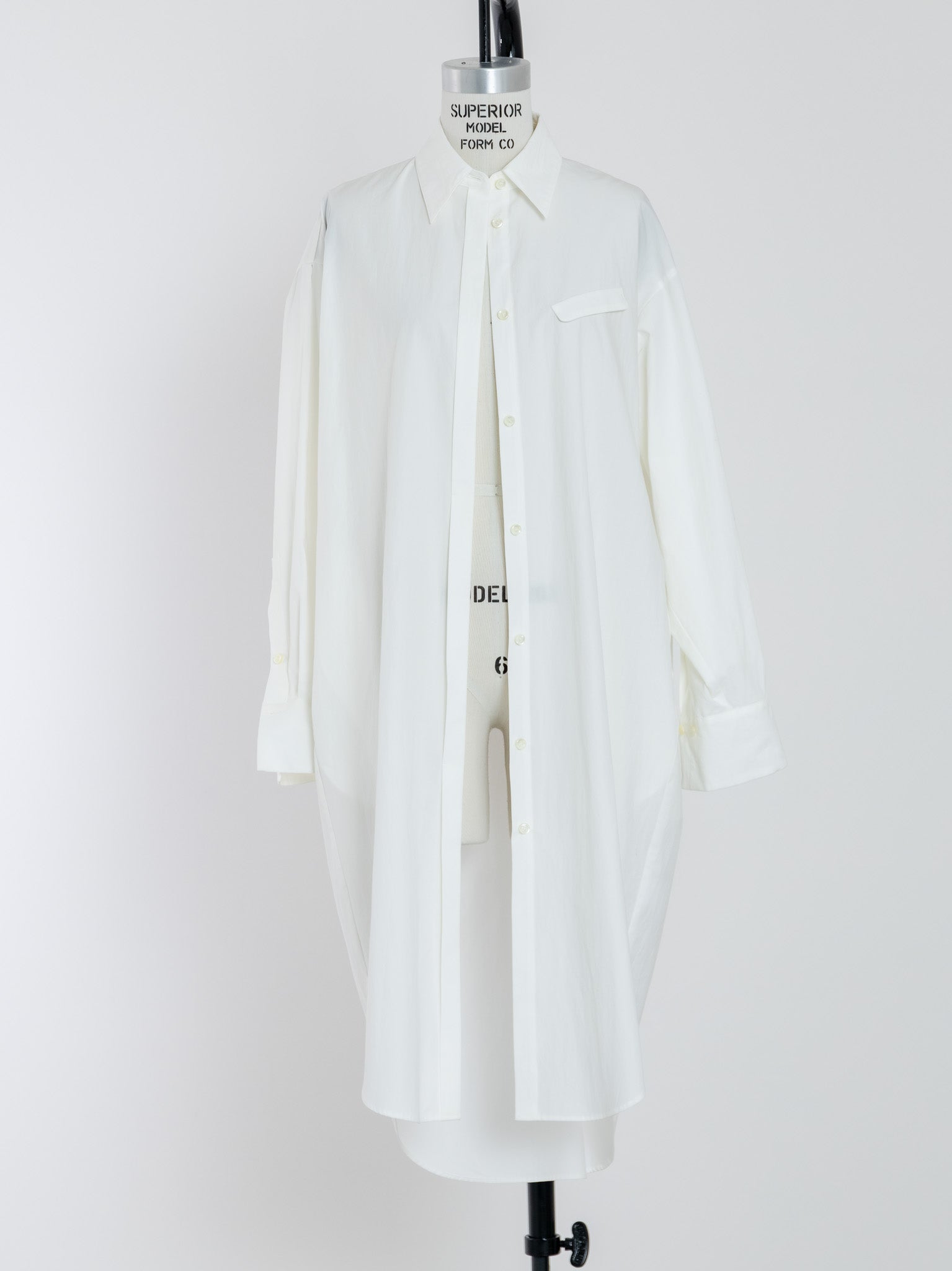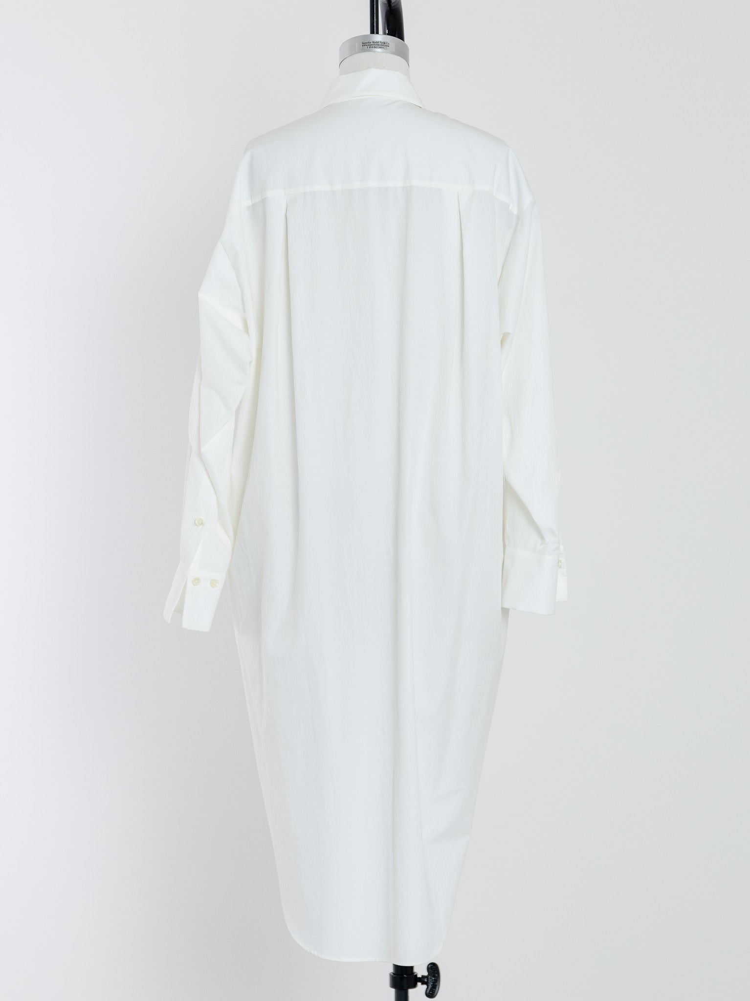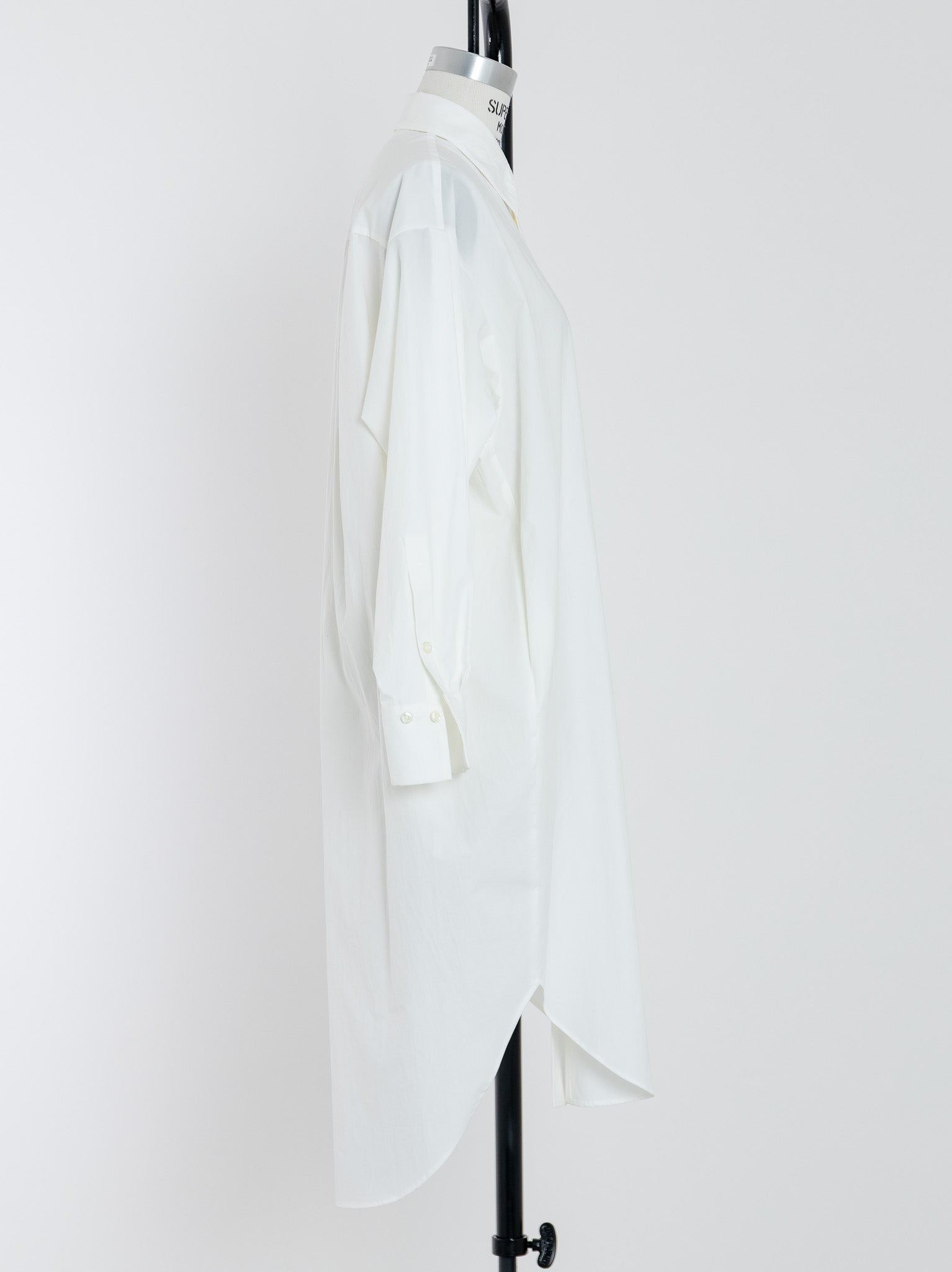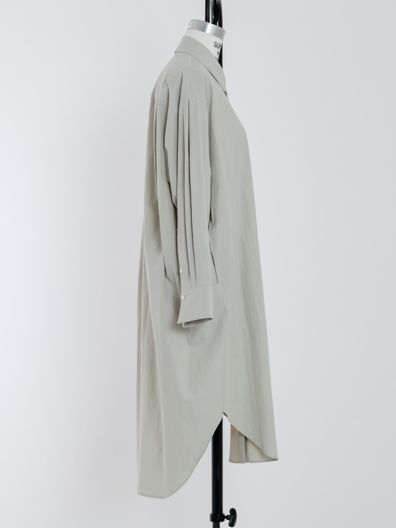 生地を贅沢に使用し、バックスタイルにたっぷりとした丸みを持たせたデザインで、裾が不必要に広がらないので、どのような身長の方にもバランスが良いロングシャツとなっています